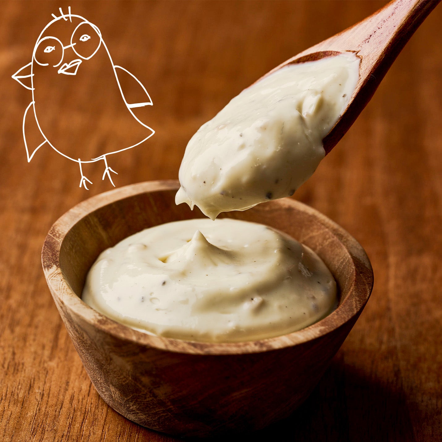 食用植物油脂(国内製造)、釀造酢、卵黄、食塩、砂糖類(砂糖、水あめ)、マスタード、ベーコン加工品、乾燥たまねぎ、フライドガーリック、チーズフード、ブラックペッパー、チキンエキス、からし粉、ガーリックパウダー、オニオンパウダー/香料、調味料(アミノ酸等)、増粘多糖類、酸化防止剤(V.E、ローズマリー抽出物)、酸化デンプン、甘味料(ステビア)、香辛料抽出物、乳化剤(一部に卵・乳成分・小麦・大豆・鶏肉・豚肉・りんごを含む )